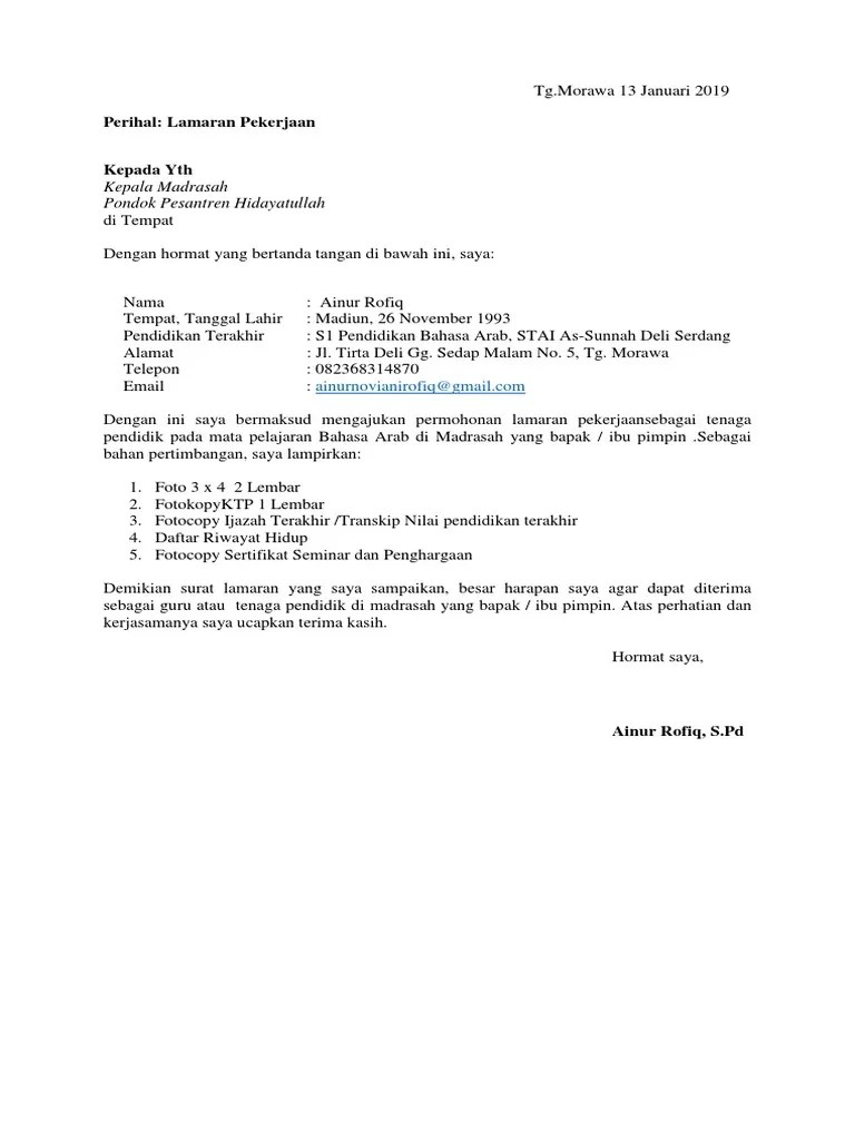Sedangkan pilihan untuk menjadi seorang pengajar atau guru, bagi sebagian orang terutama bagi mereka yang lulusan . Perhatikan beberapa contoh surat lamaran kerja guru agar kamu bisa membuat surat lamaran . Namun walaupun sekolah tersebut tidak membuka lowongan kerja, maka tidak ada salahnya untuk melamar kerja disana, walaupun mungkin hanya sebagai guru honorer. Tempat dan tanggal surat lamaran guru ditulis · 2. Format surat lamaran kerja guru yayasan · fotokopi ijazah · fotokopi transkrip 1 lembar (legalisir) · fotokopi ktp · skck 1 lembar · surat .